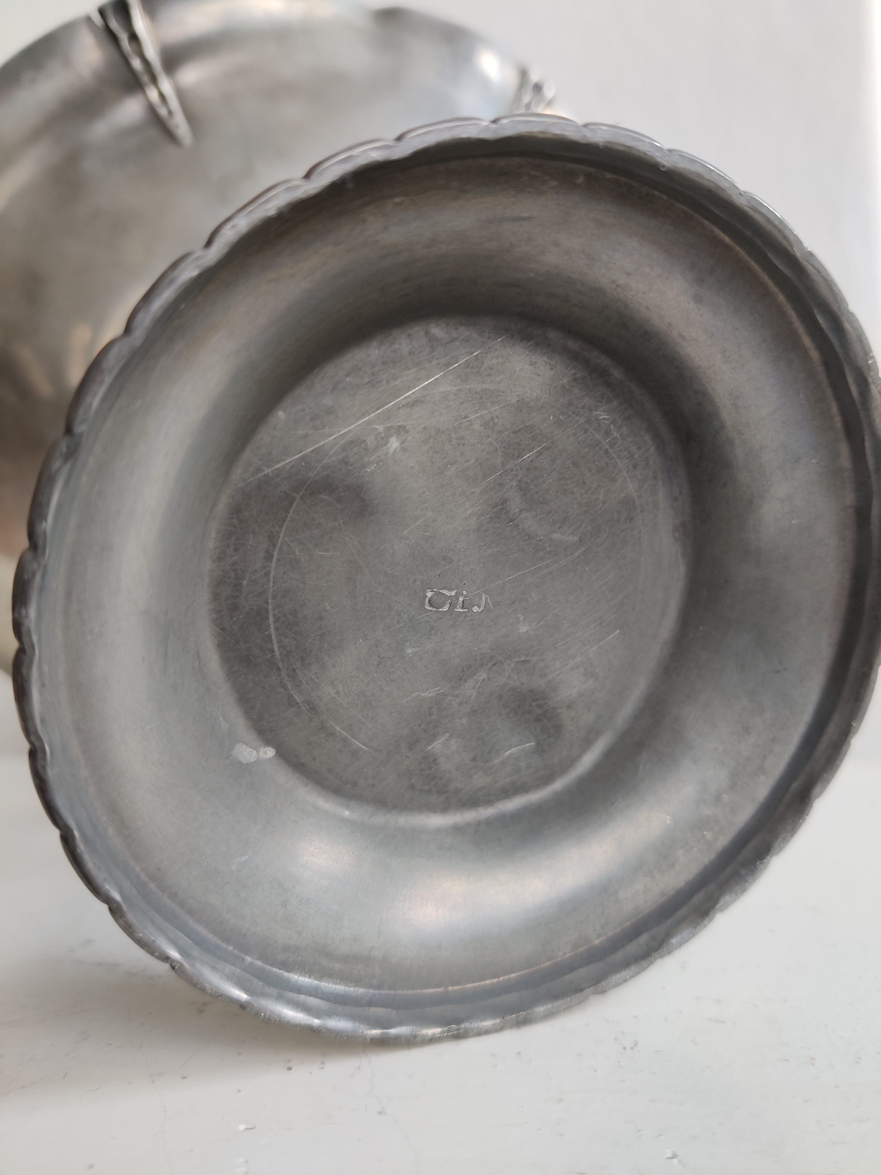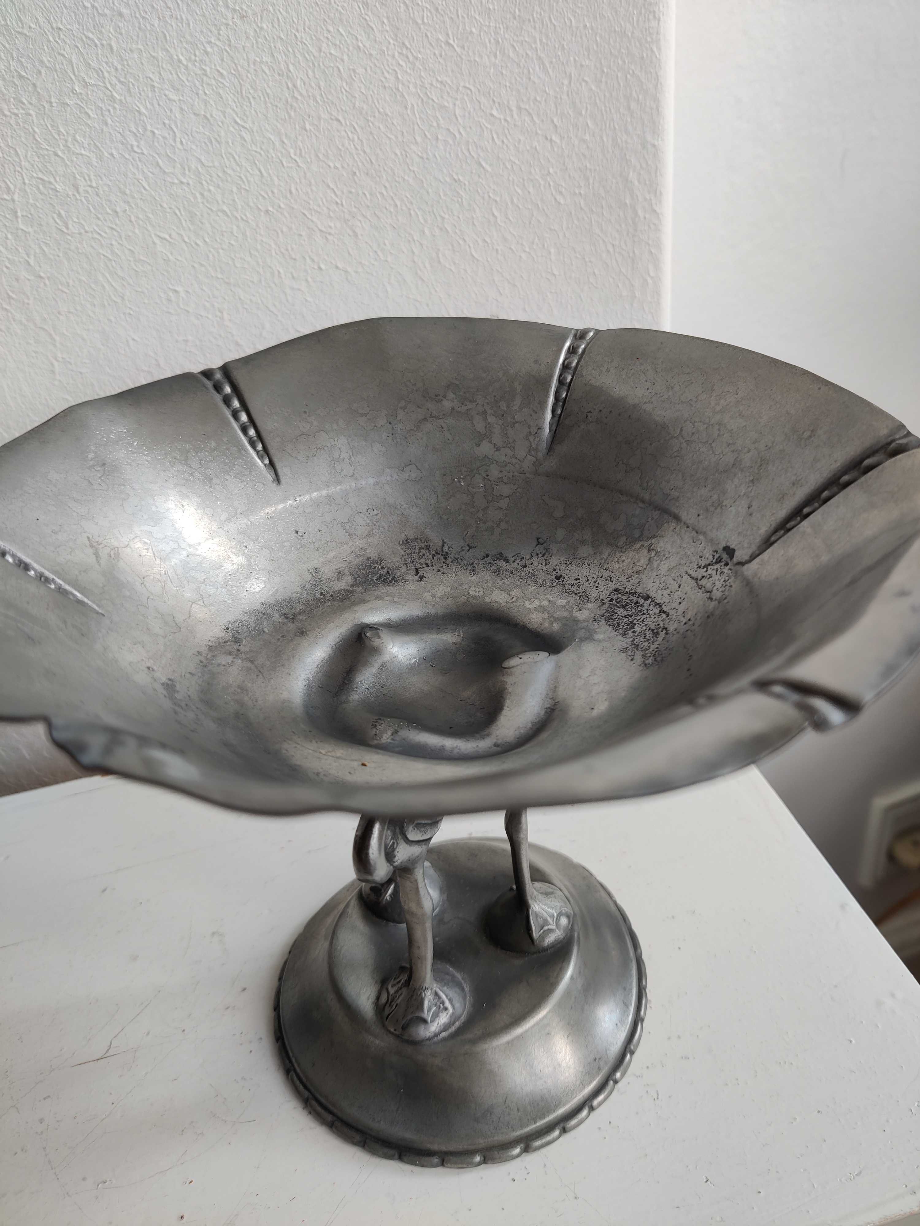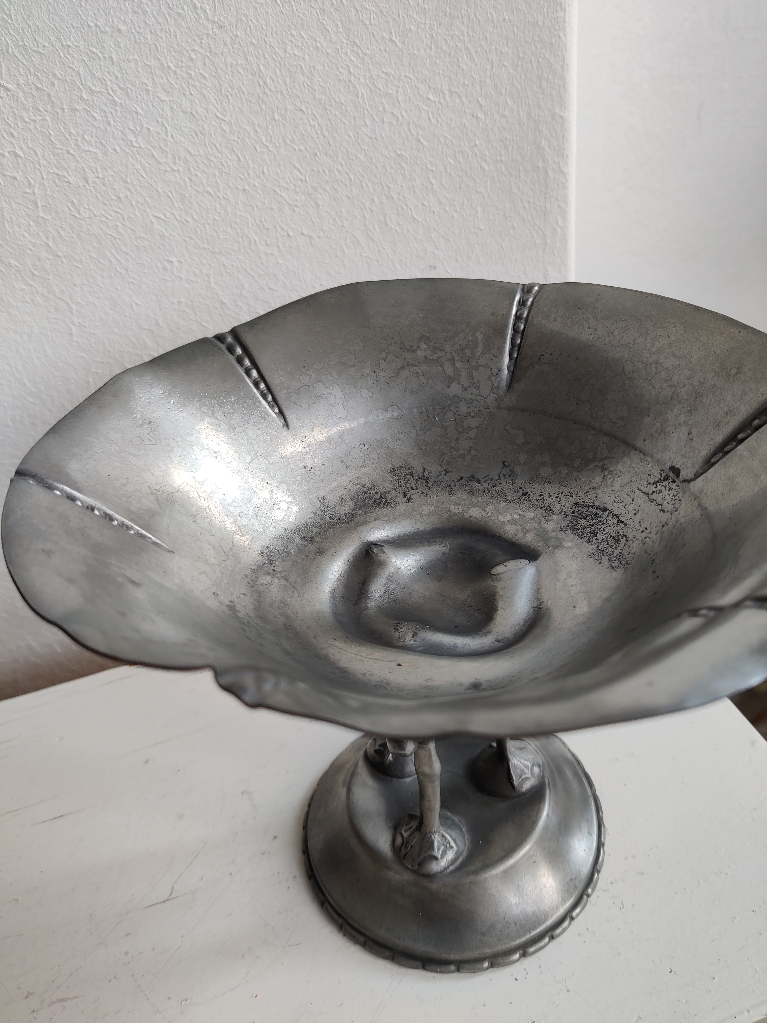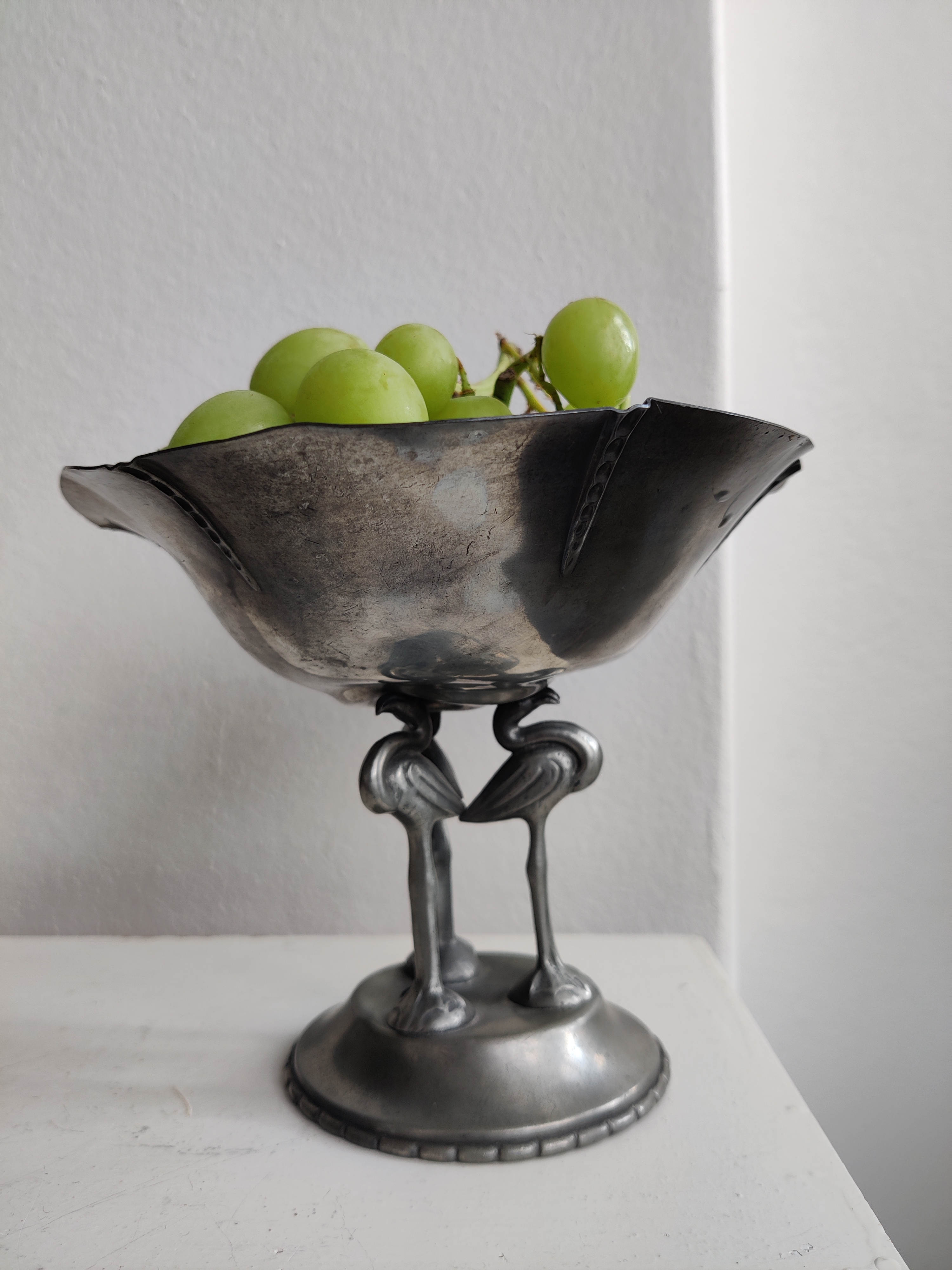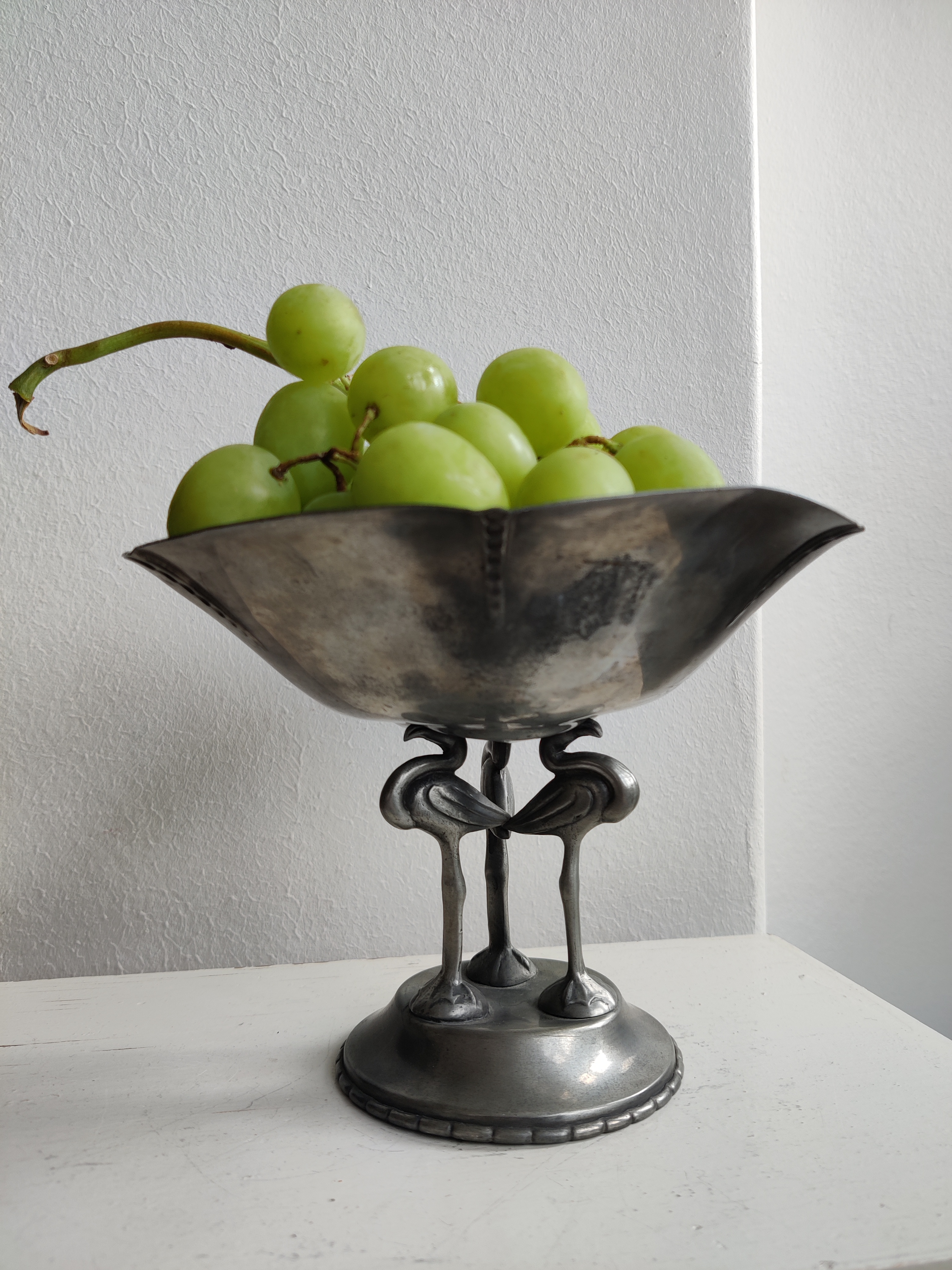 Sætter man denne art deco opsats på bordet, bliver det tydeligt, at 1920'erne var en hel del sjovere end 2020'erne er. For intet mindre end tre fikse flamingoer holder skålen oppe, så du kan fylde den med frugt, søde sager eller dekoration. Materialet er tin. Lidt skæv, men det er fair nok, når man nu er hundrede år. Mål 18 x 14 cm.