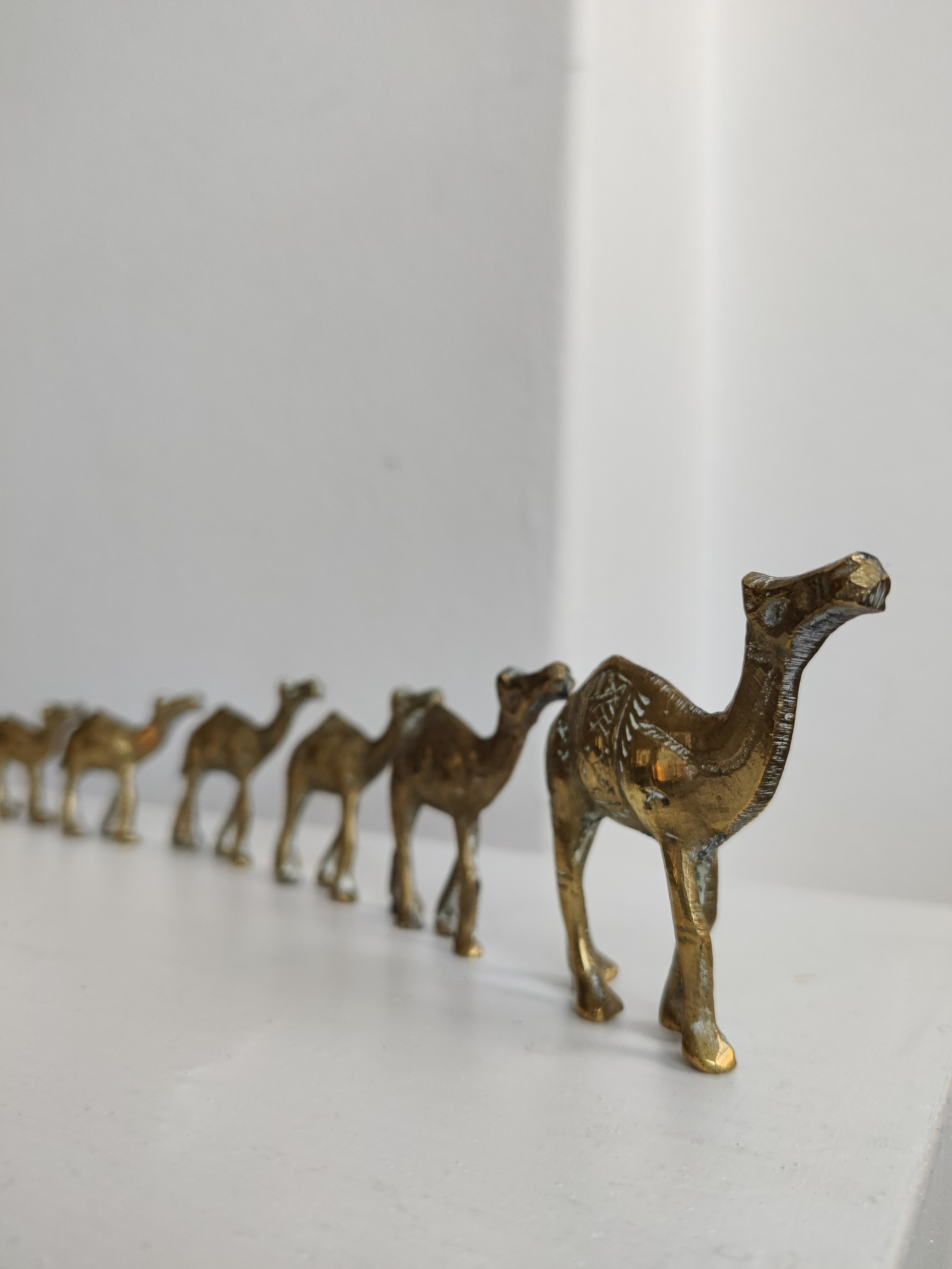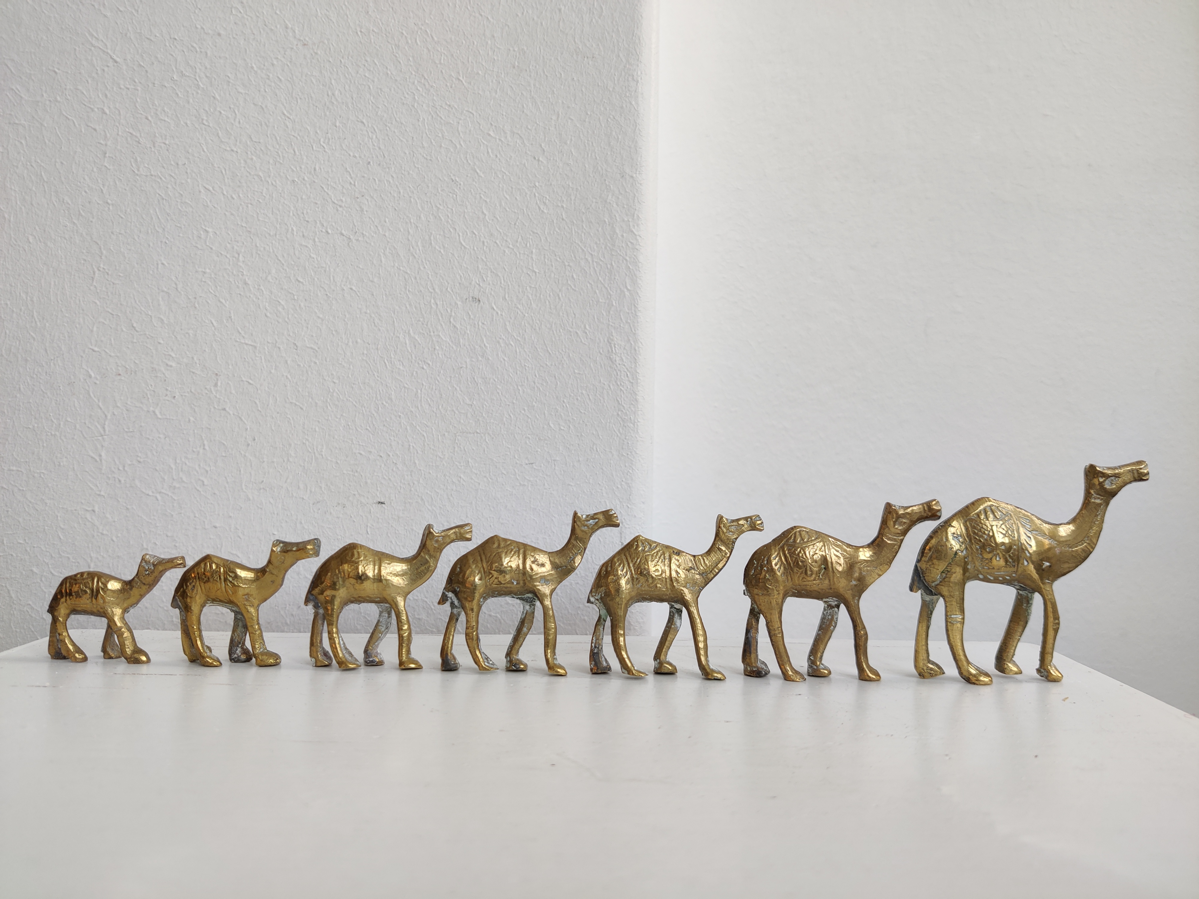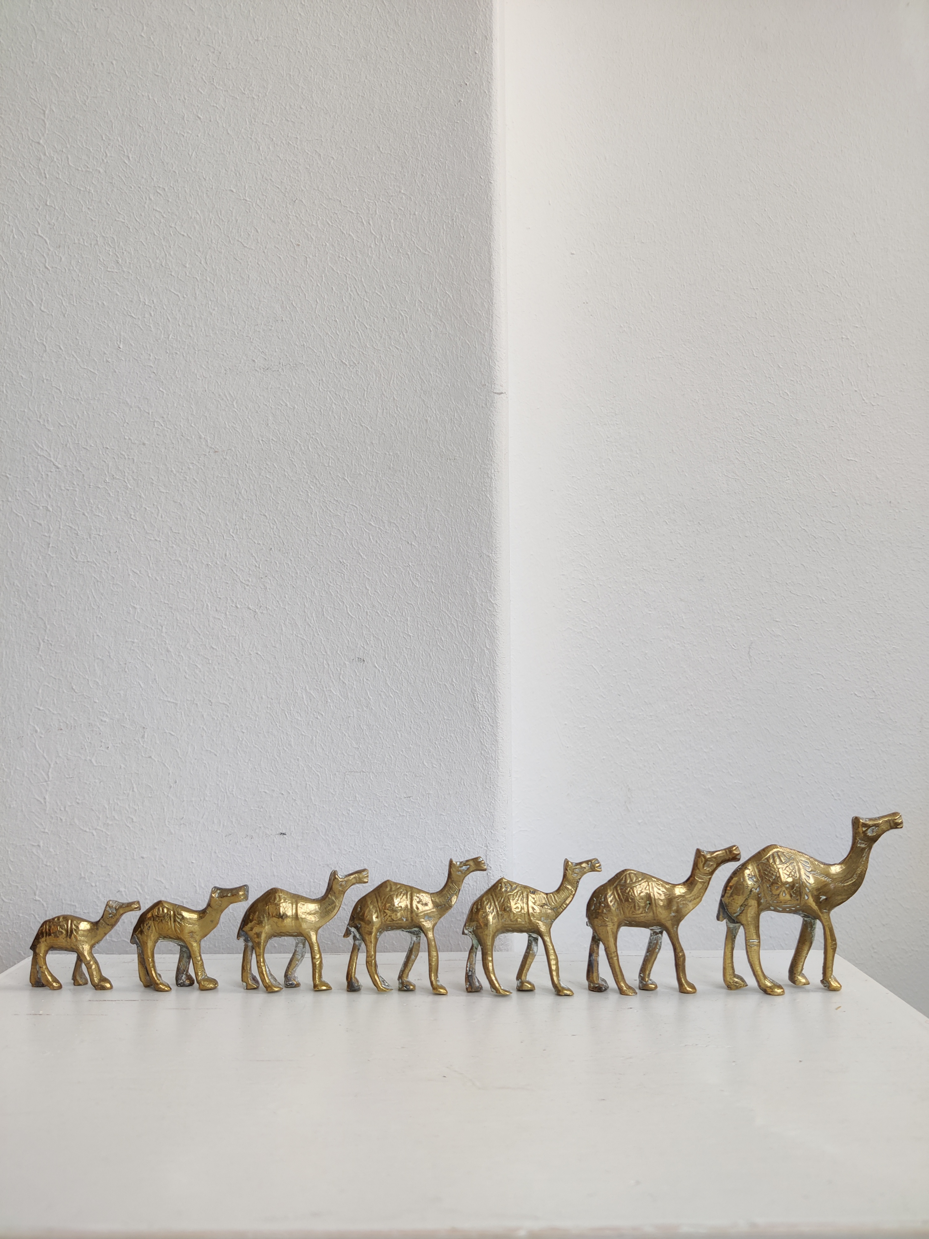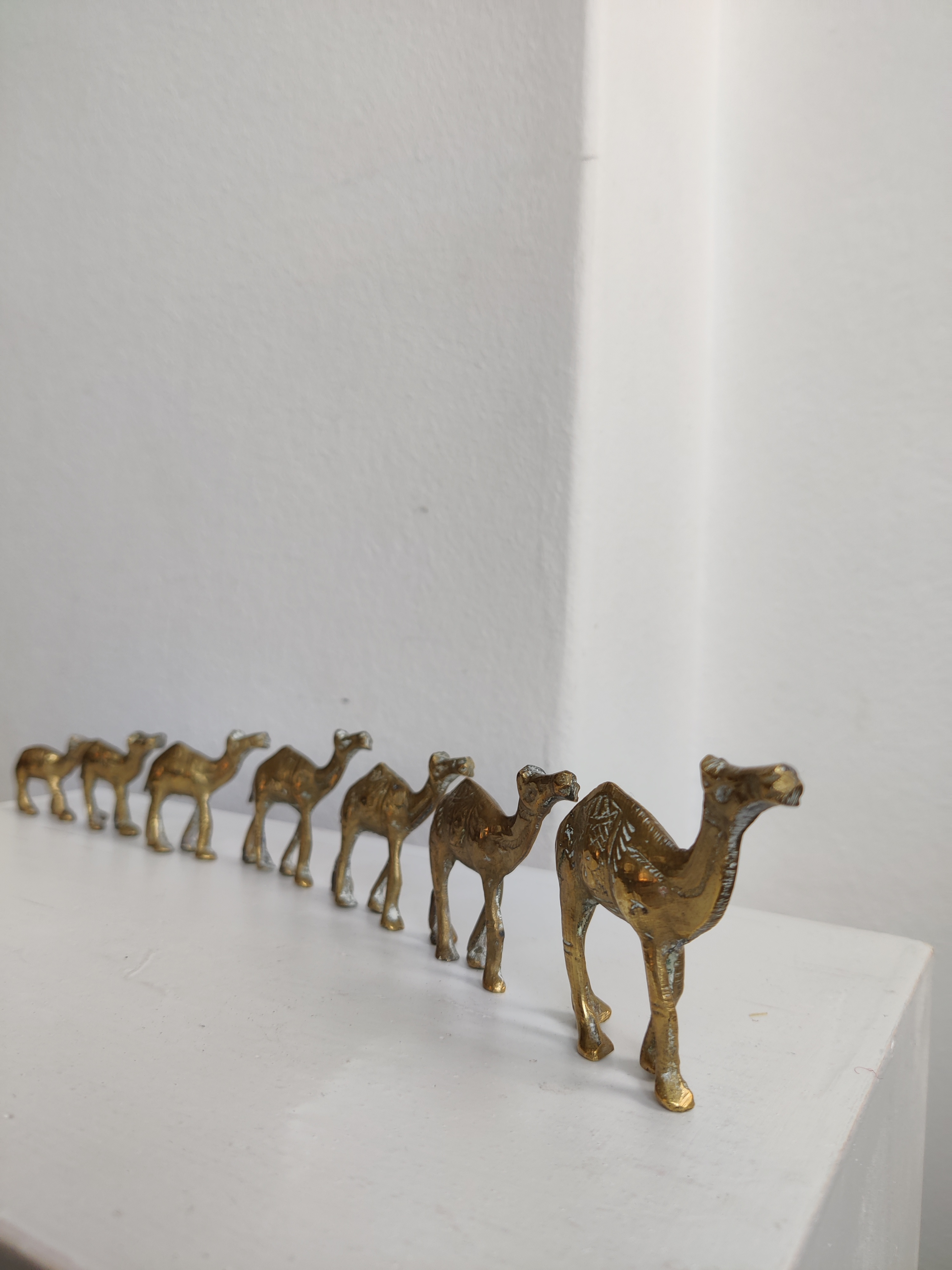 Dejlig karavane til din vindueskarm med 7 kameler i messing. Den største er 6,5 cm og den mindste 4 cm.