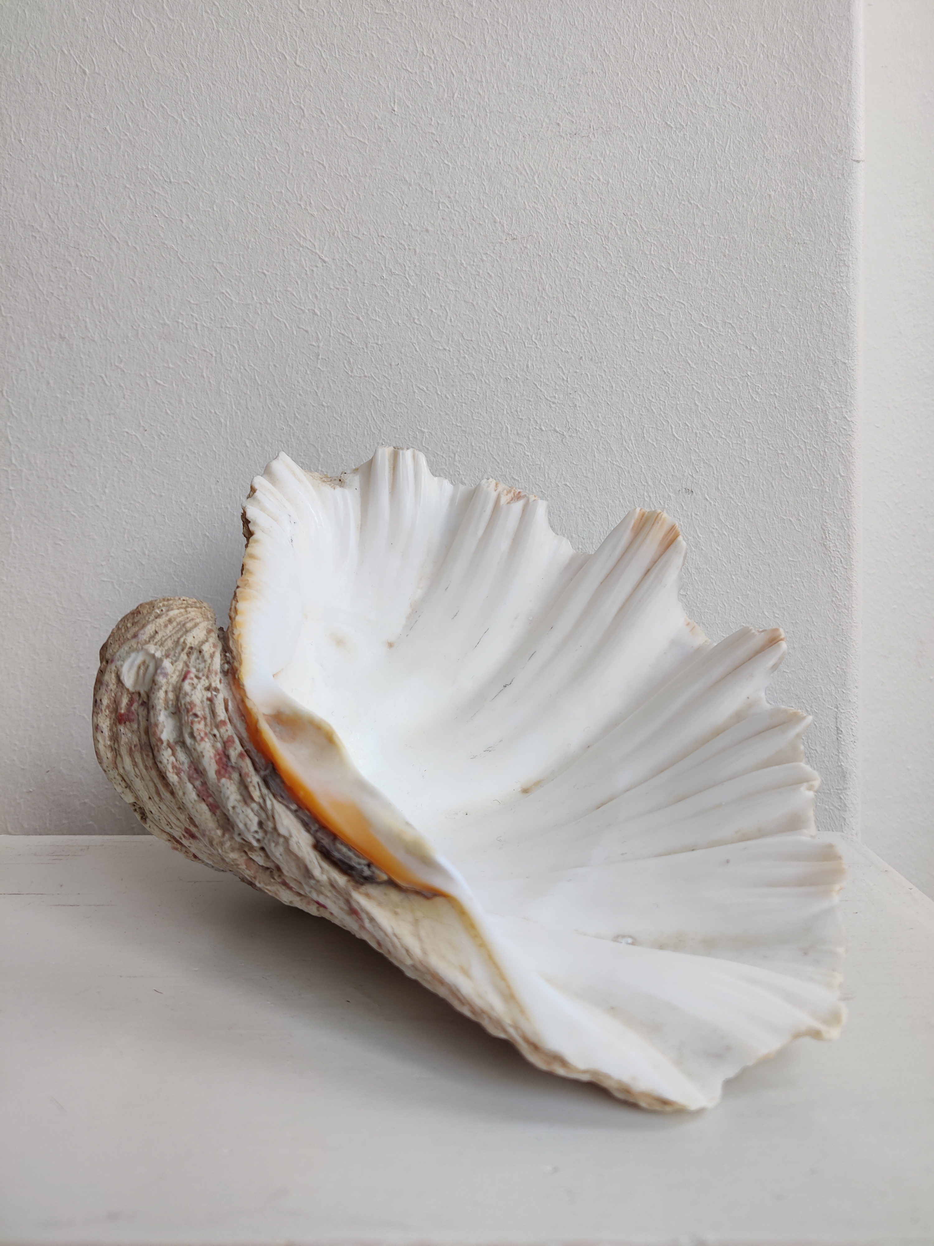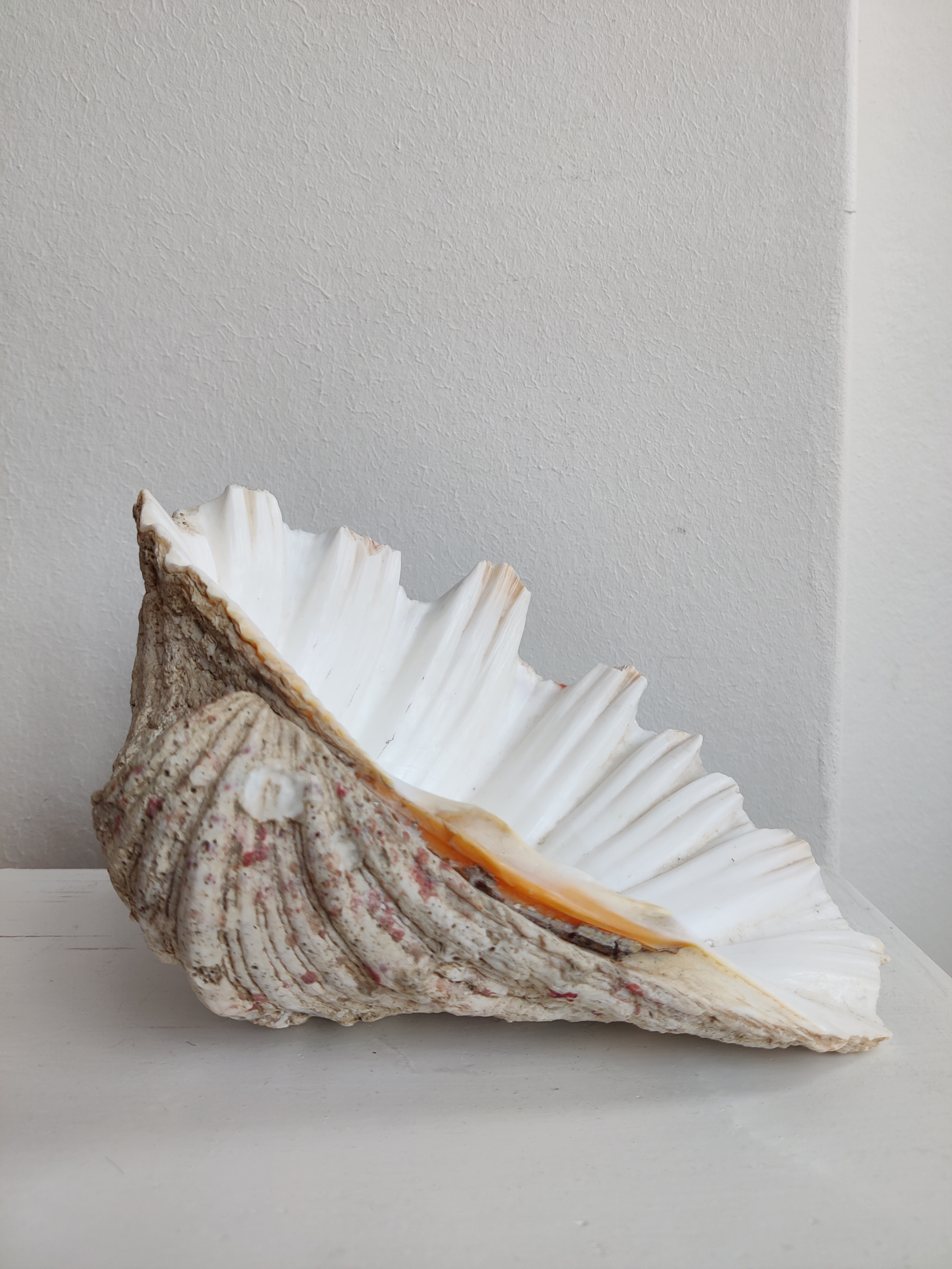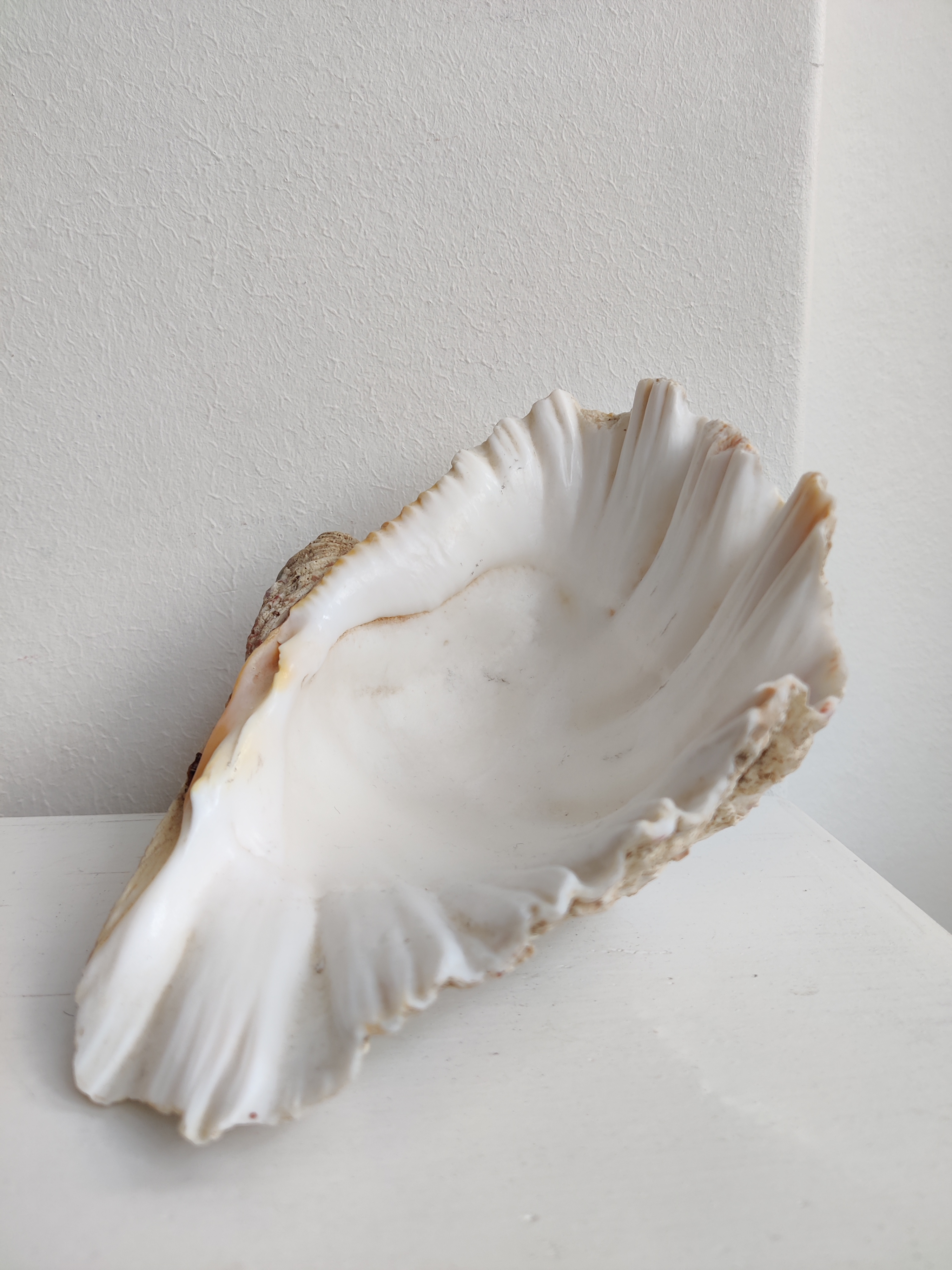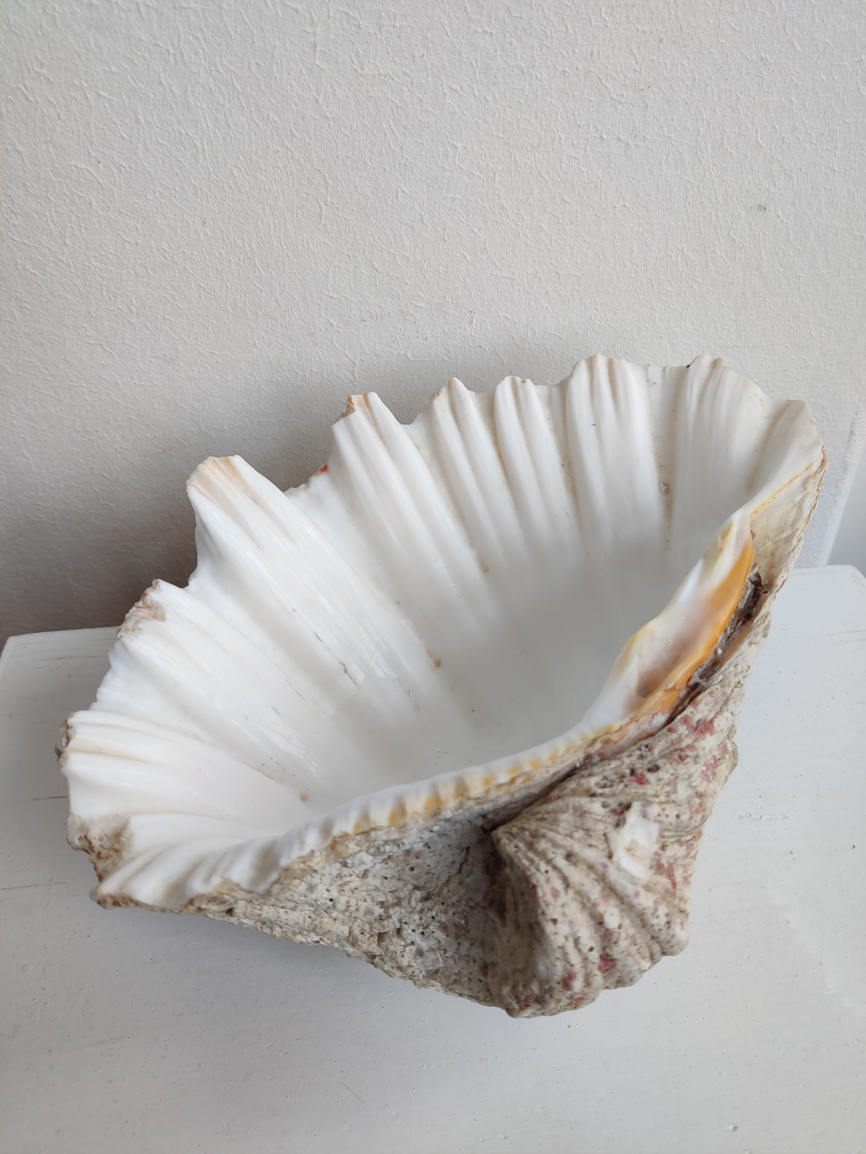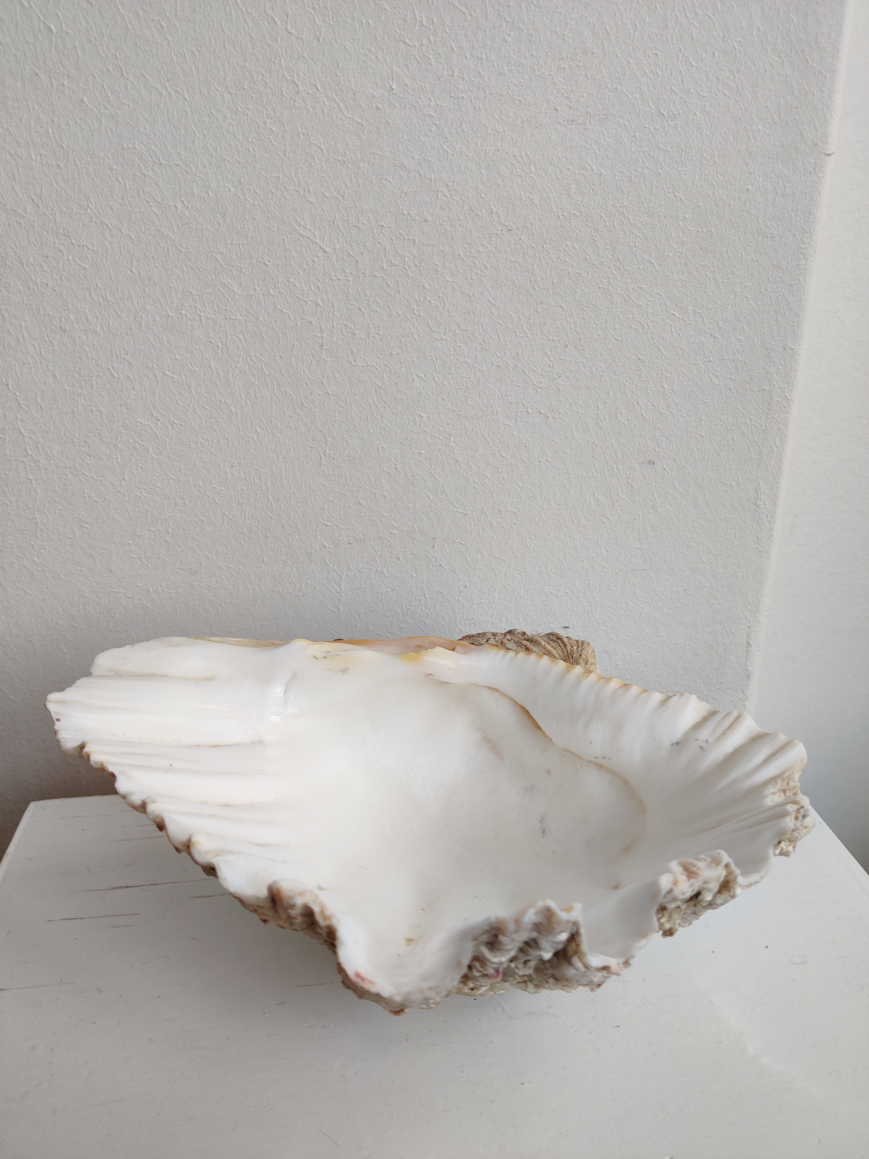 Ægte kæmpe muslingeskal til dekoration i dit vindue, på dit badeværelse, til smykker, i haven - du bestemmer. Den måler 22 x 16 x 9 cm.
