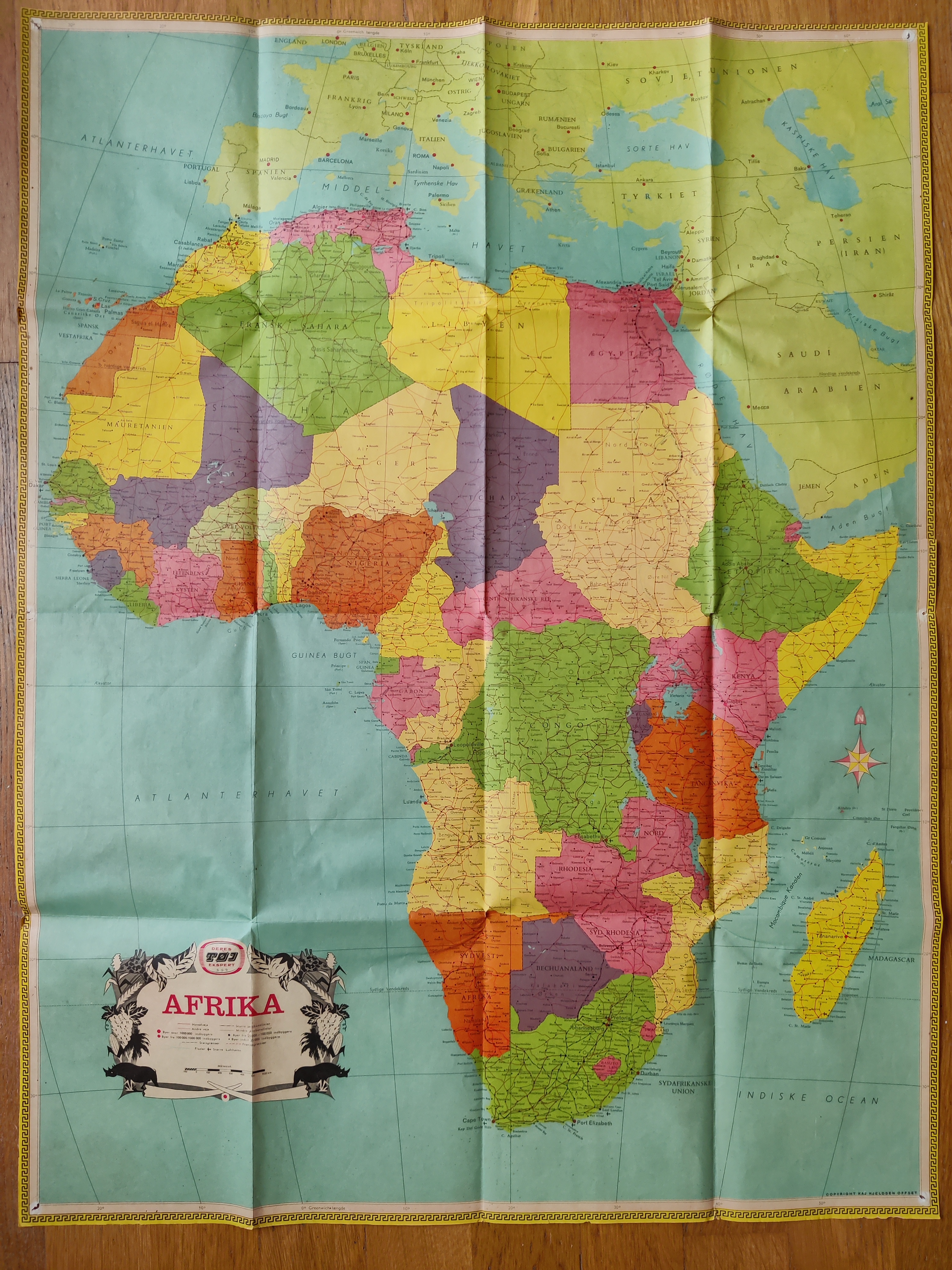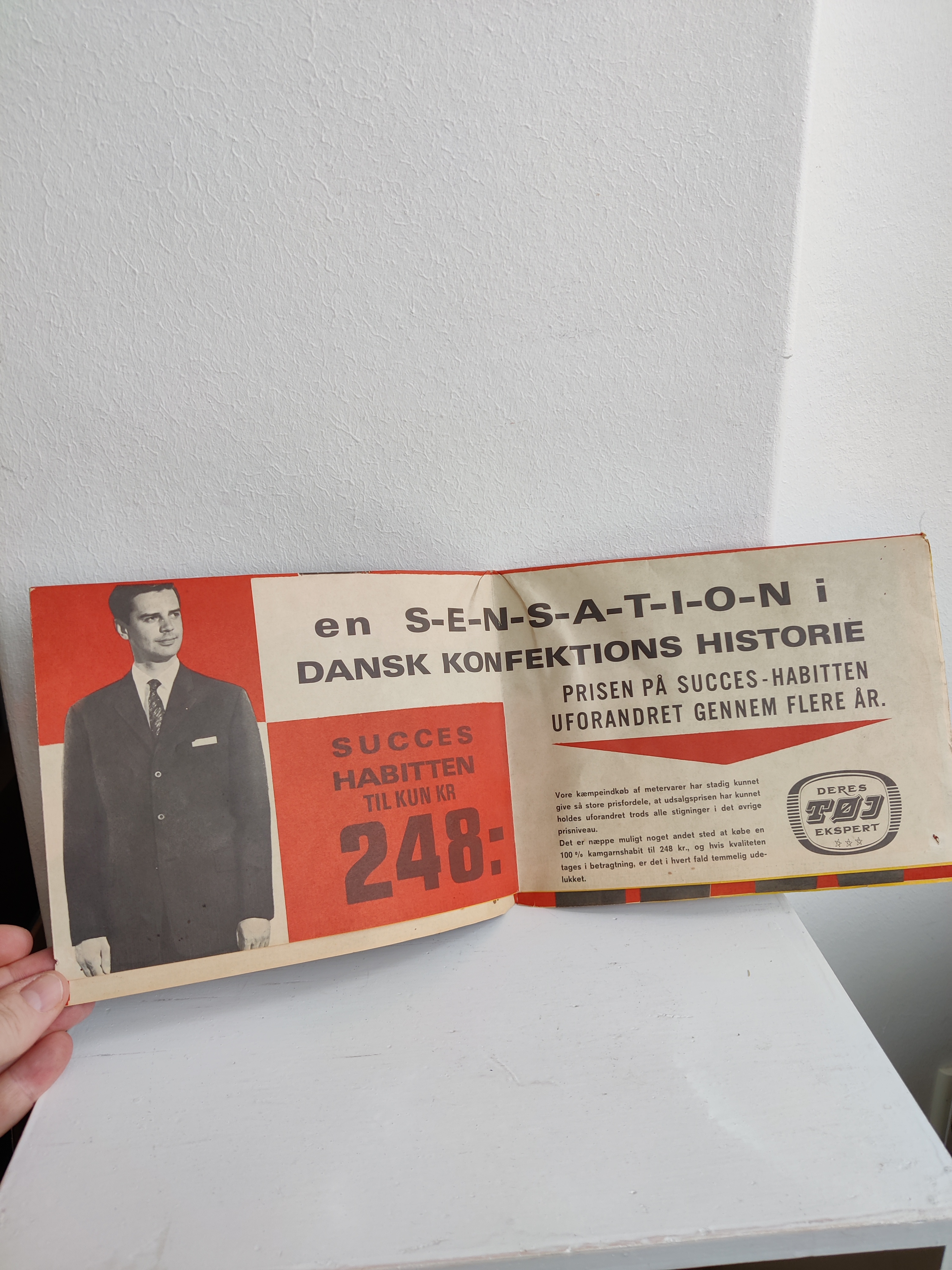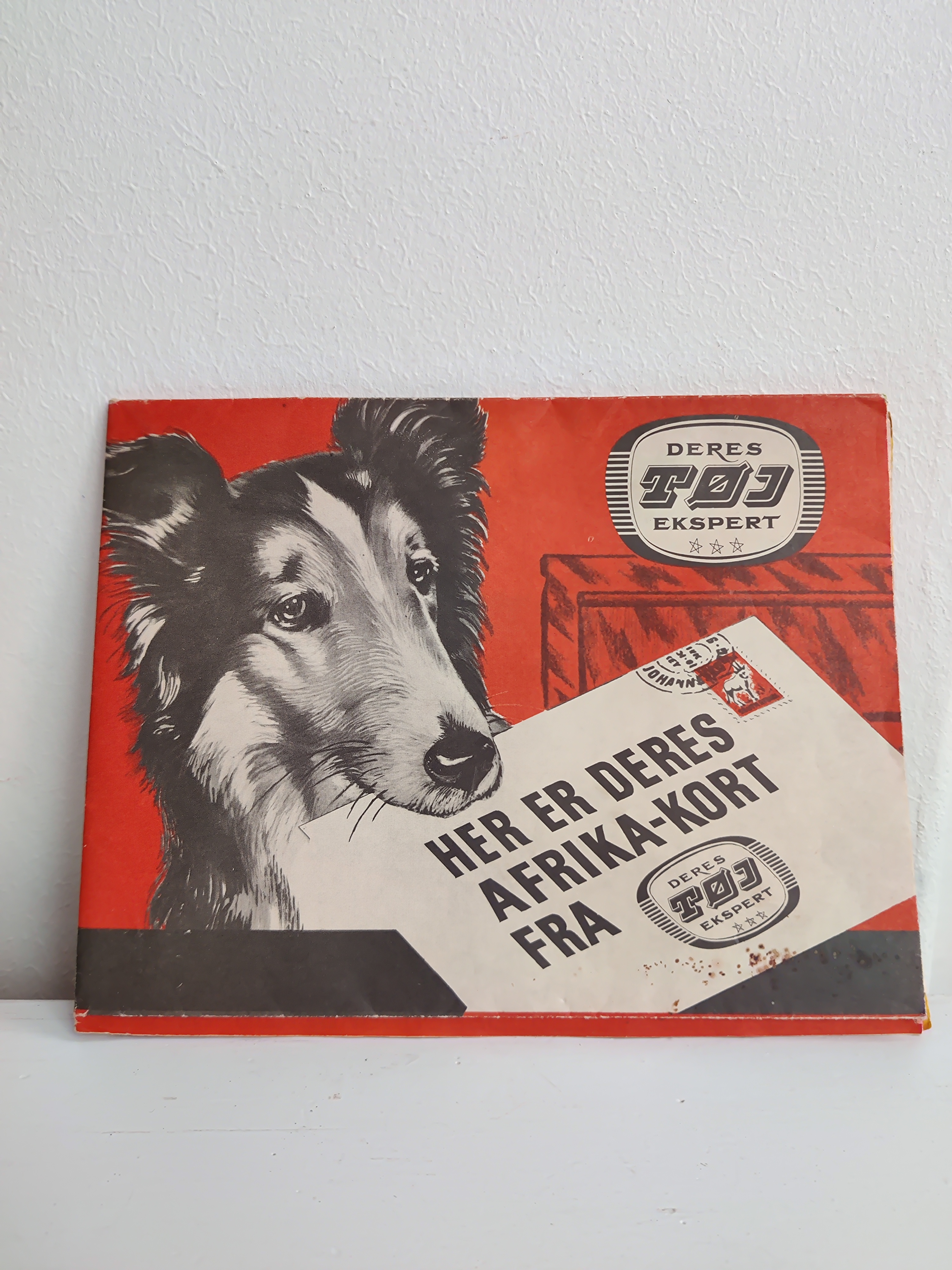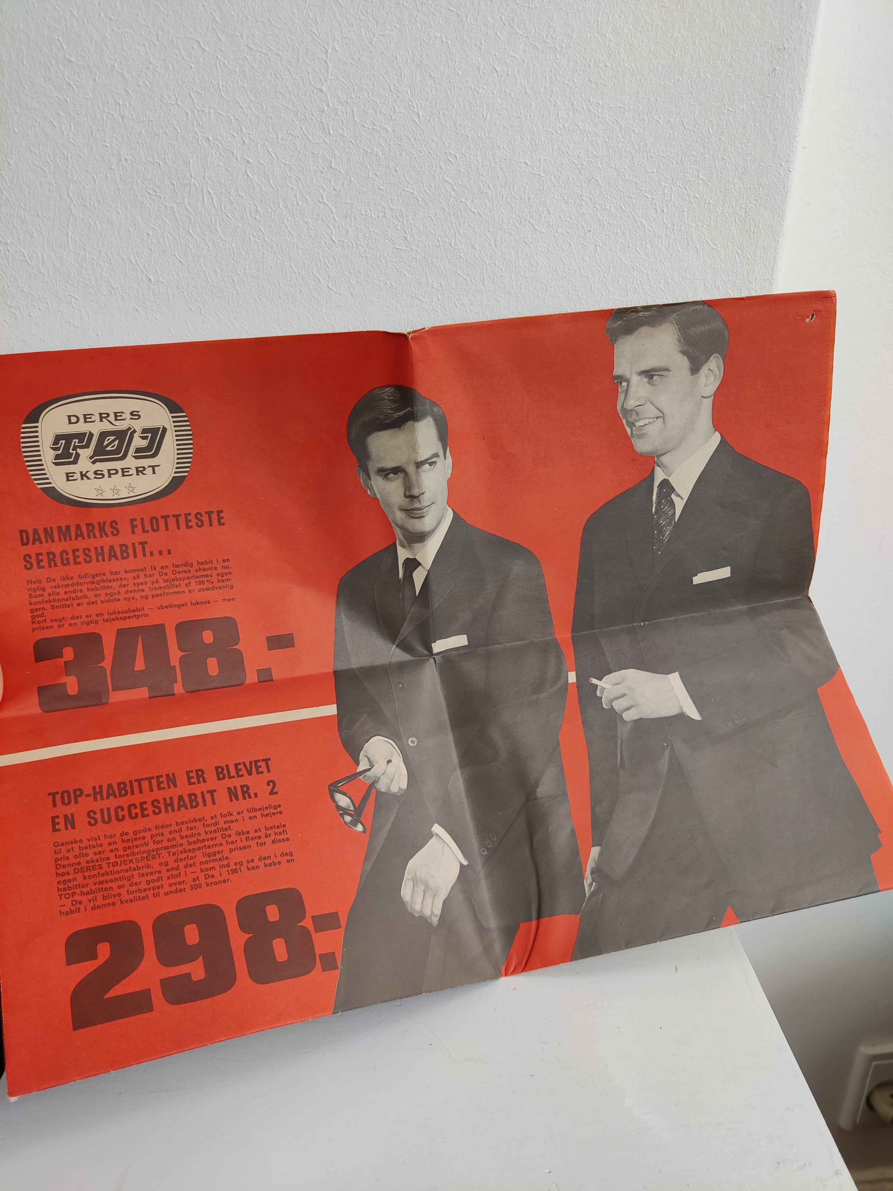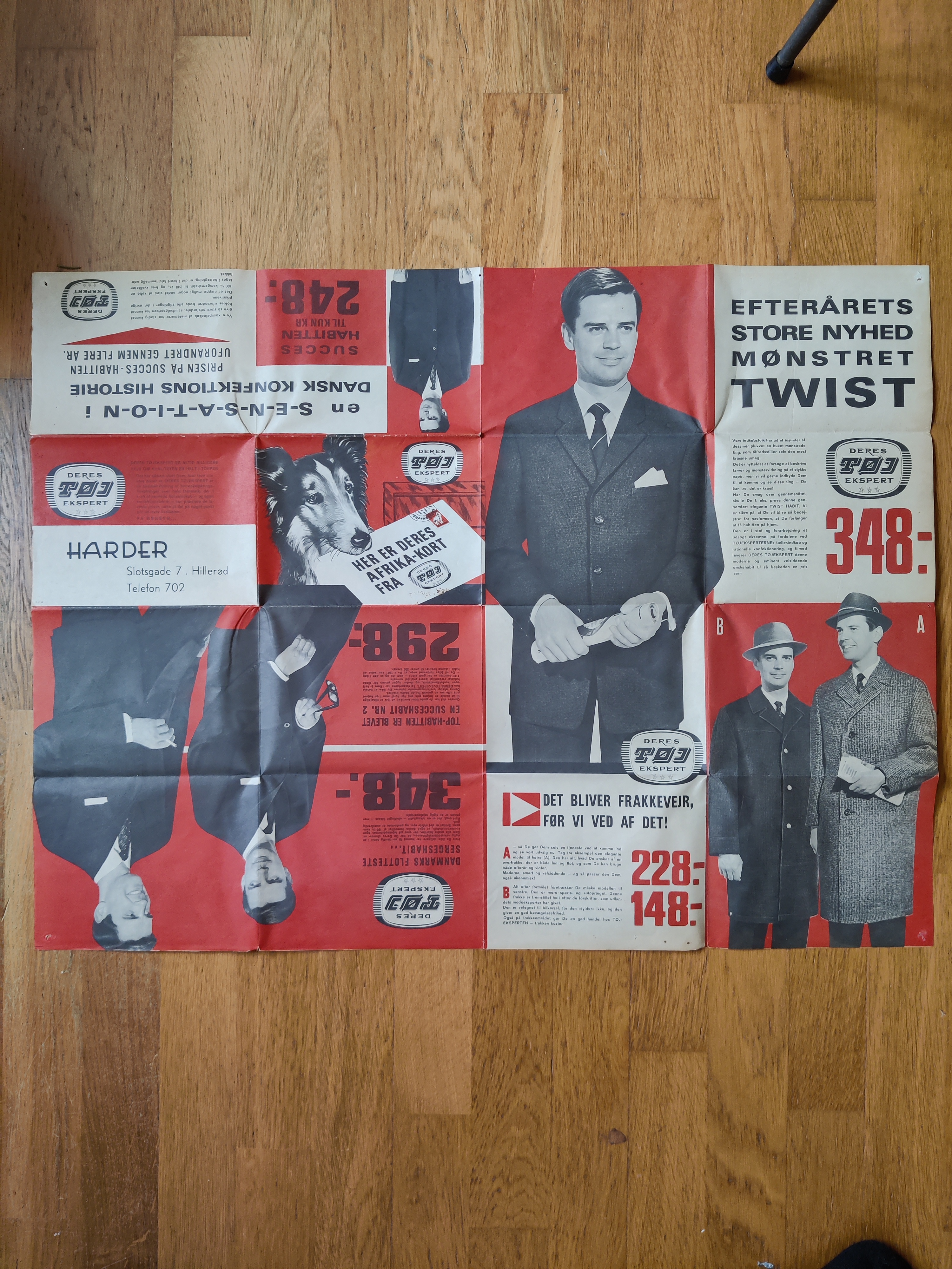 Folde-ud reklame for herretøj med stort kort over Afrika på bagsiden, så man huskede, at Deres Tøj Ekspert var stedet for den elegante mand i starten af 1960'erne. Vi er bestemt ikke i ungdomssegmentet for Beatleshår, og jeg gad virkelig godt vide, hvem modellen var? En pæn mand med opbyggelige gøremål som at ryge cigaretter og læse aviser. I god patineret stand. Mål 80 x 60 cm.