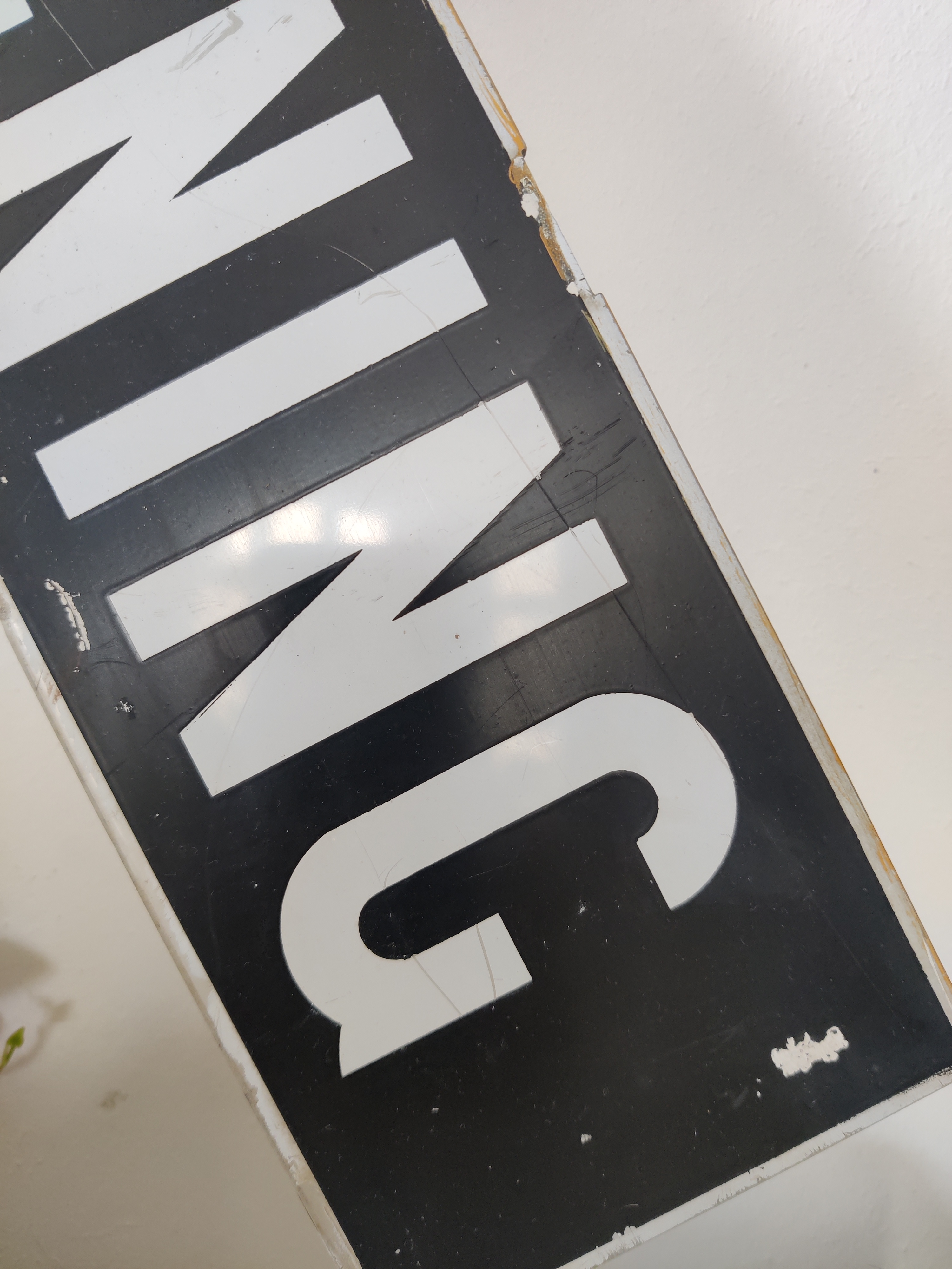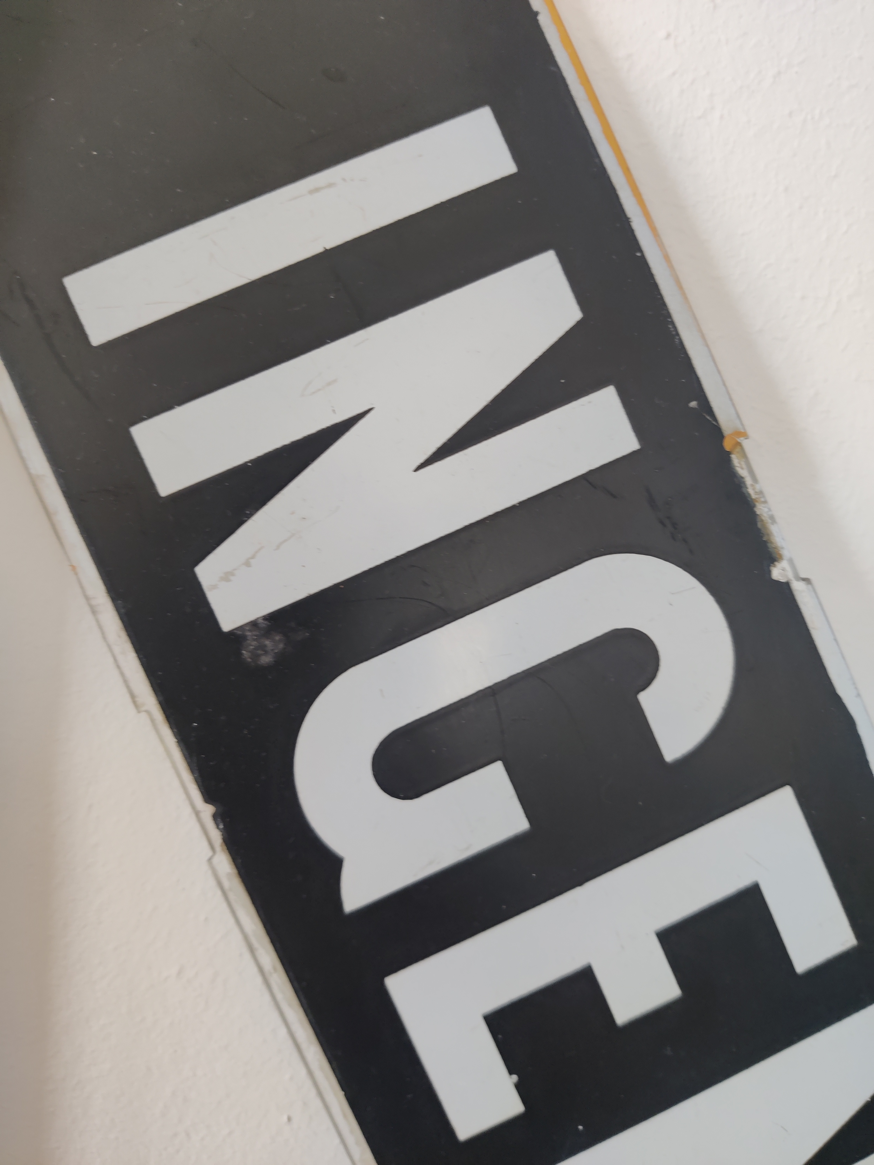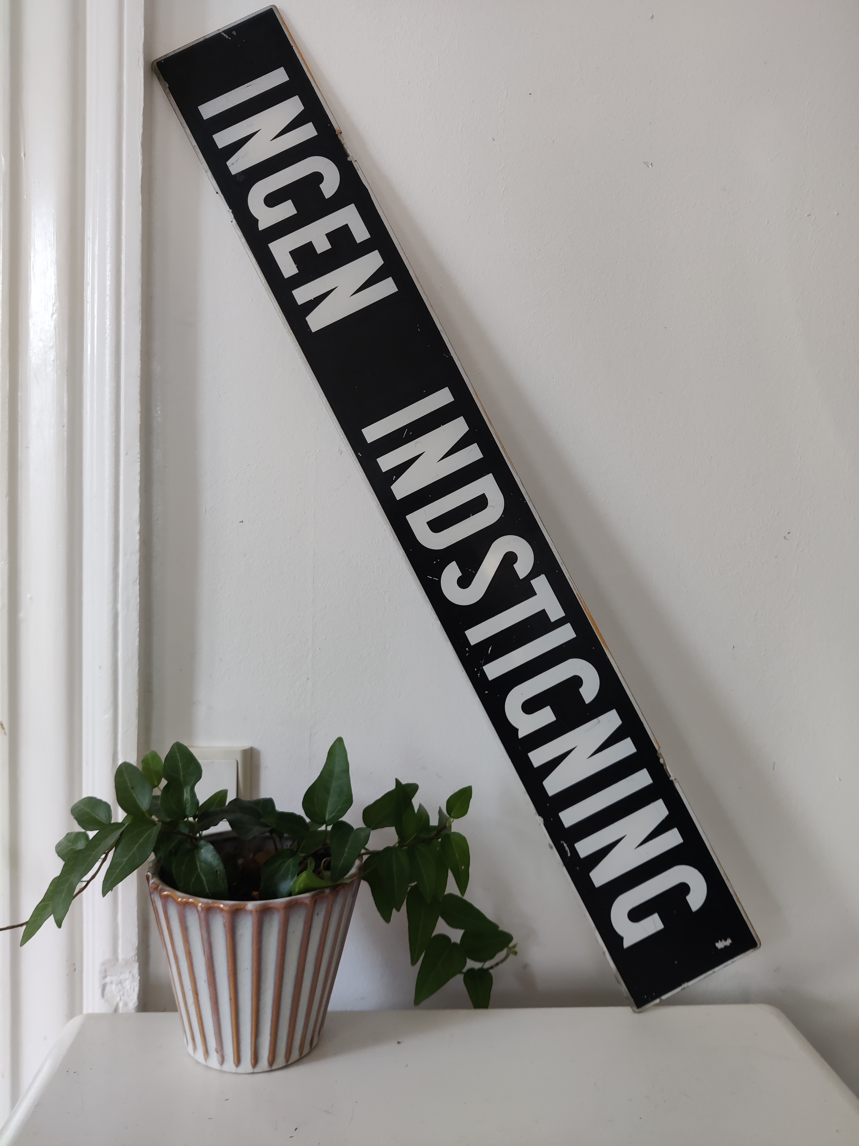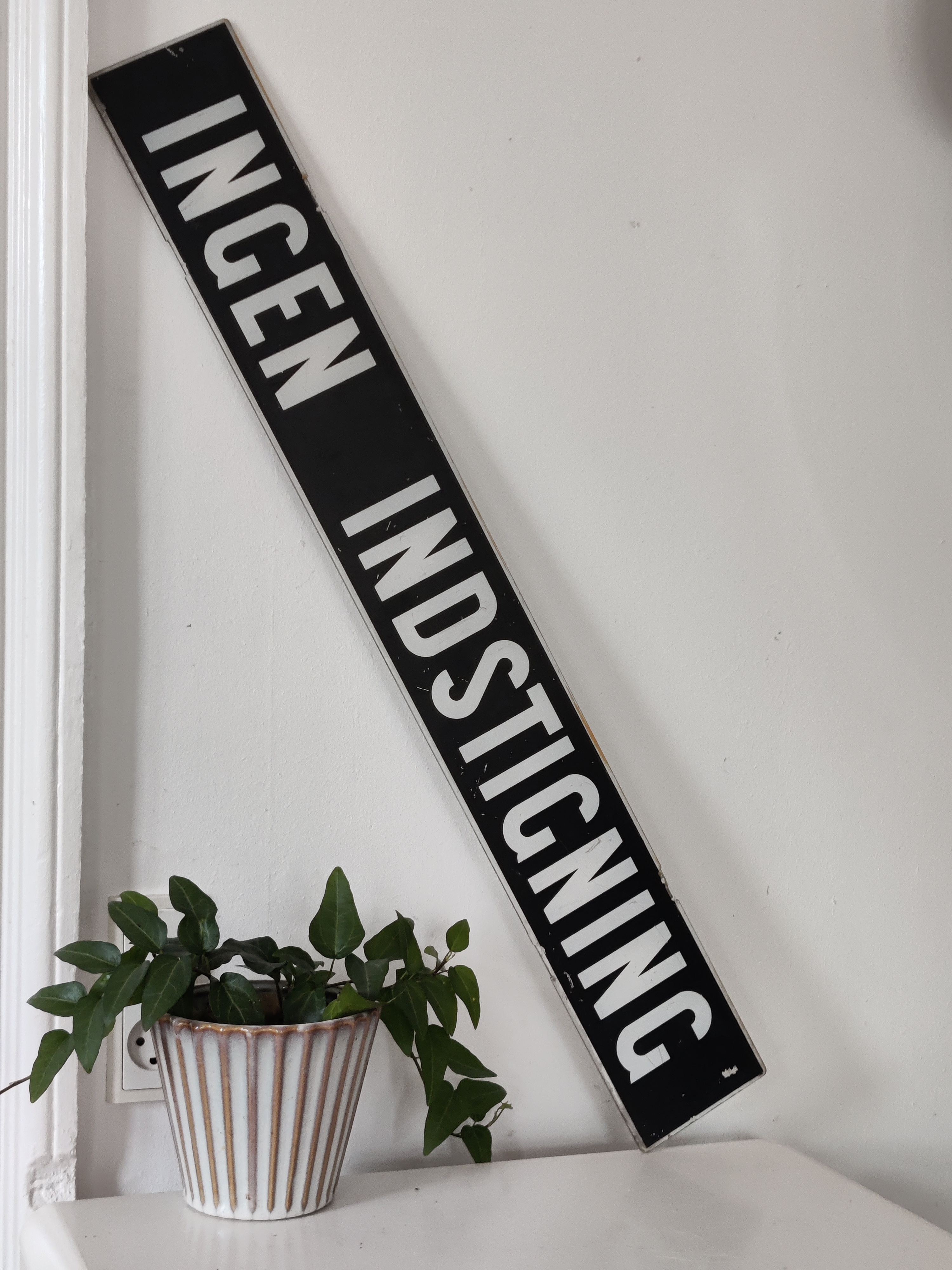 Flot gammelt sporvognsskilt med teksten Ingen Indstigning. Måler hele 82 cm x 11 cm. Bemalet plexiglas. De københavnske sporvogne kørte fra 1863-1972 og skiltet her er nok fra de sidste 20 år af den æra. Det har siddet over den forreste dør i vognen, som det kan ses her hos Kgs. Enghave Lokalhistoriske Arkiv. Skiltet har brugsspor og fin patina, se alle billeder.