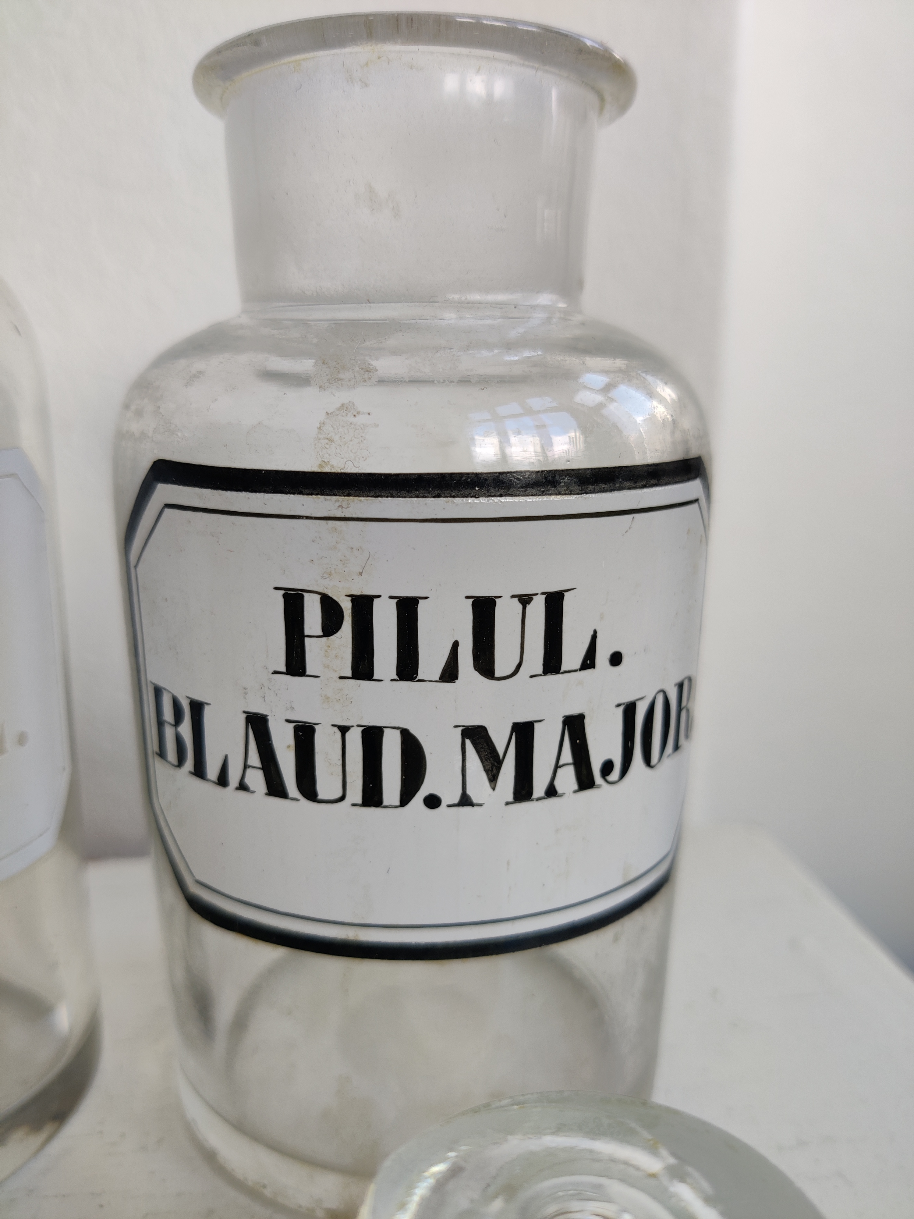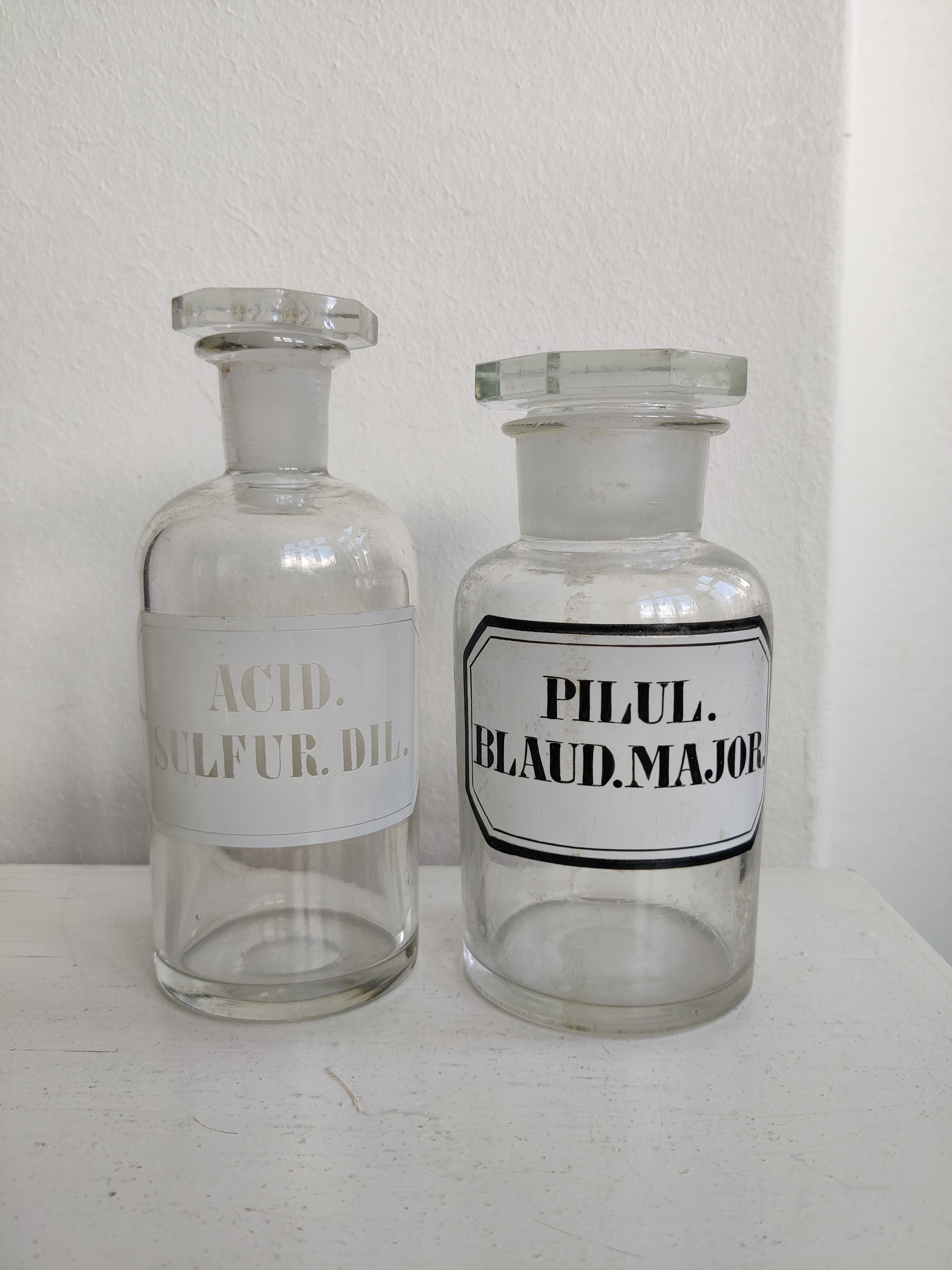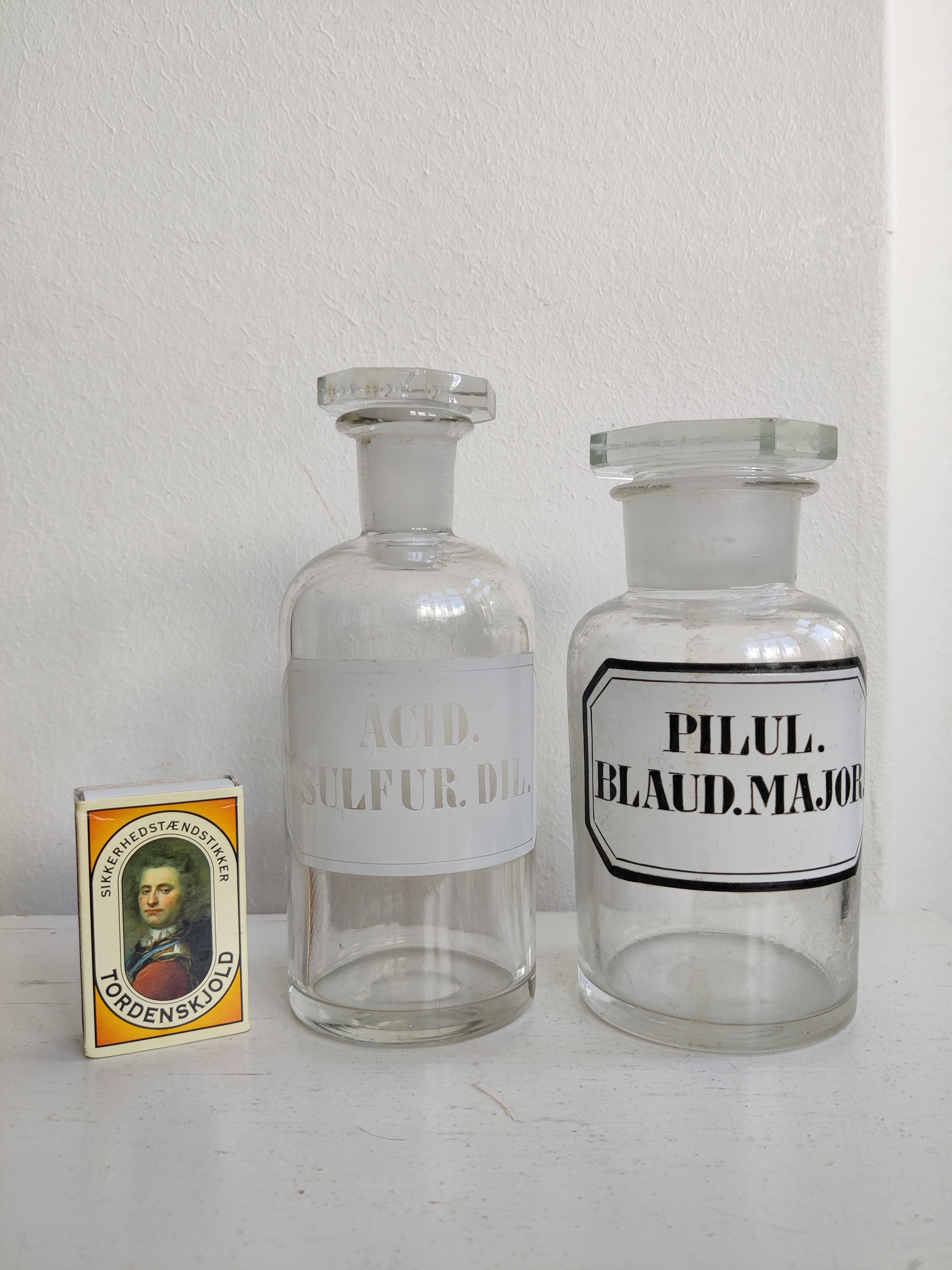 To mindre, antikke apotekerflasker til henholdsvis fortyndet svovlsyre (Acid Sulfur Dil.) og store Blaud-piller (Pilul. Blaud. Major) - jerntabletter opfundet af franskmanden Jean-Pierre Blaud i 1832 mod anæmi. Meget smukke gamle sager, der er så dekorative og fulde af historie. Måler hhv 14 og 15 cm i højden. Acid Sulfur har et hak i proppen. Sælges sammen.